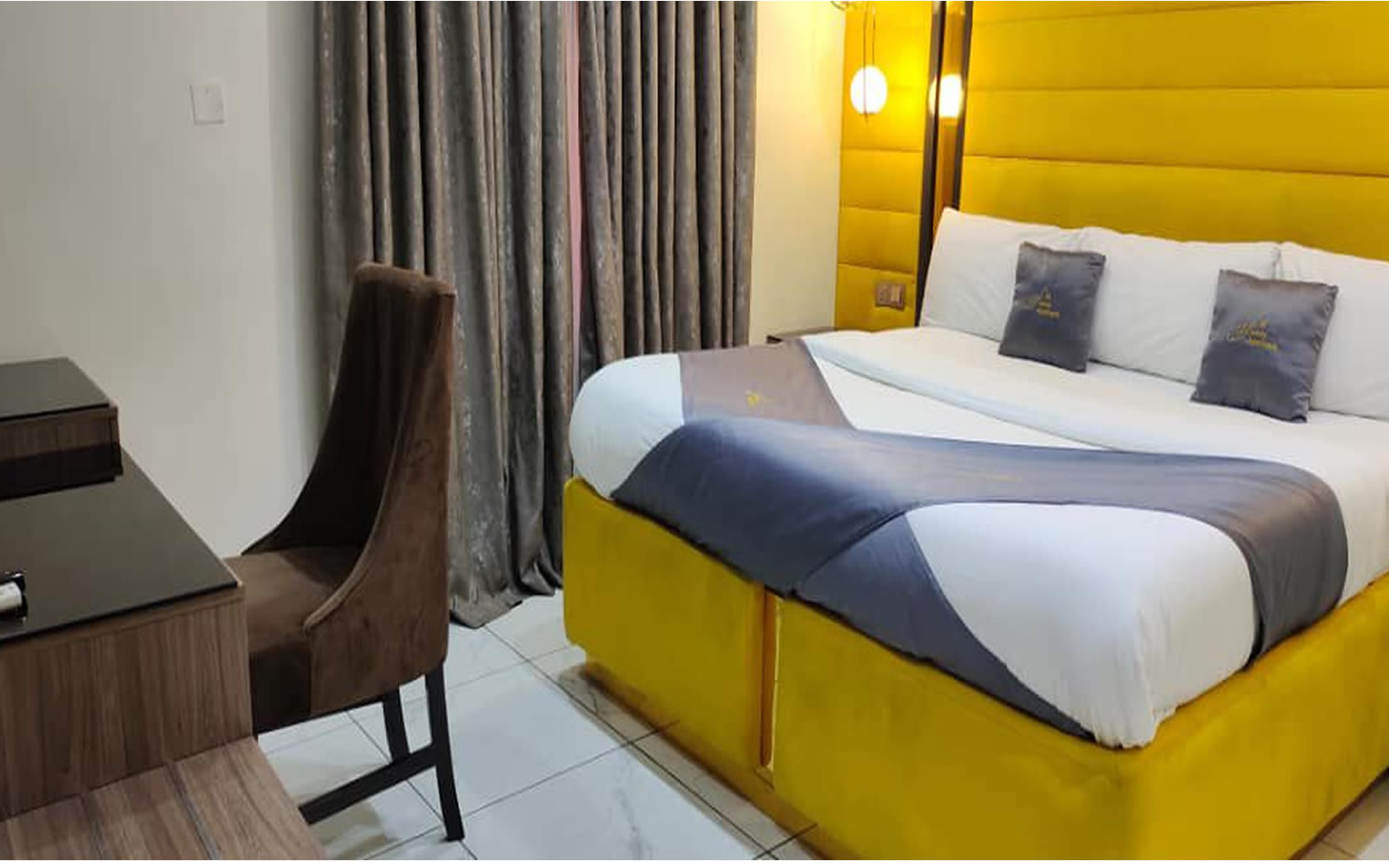 The dark wood panelling and furnishings, deluxe red-draped four-poster bed, and magnificent black stone bathroom evoke the charm of a secluded Sierra Nevada getaway.